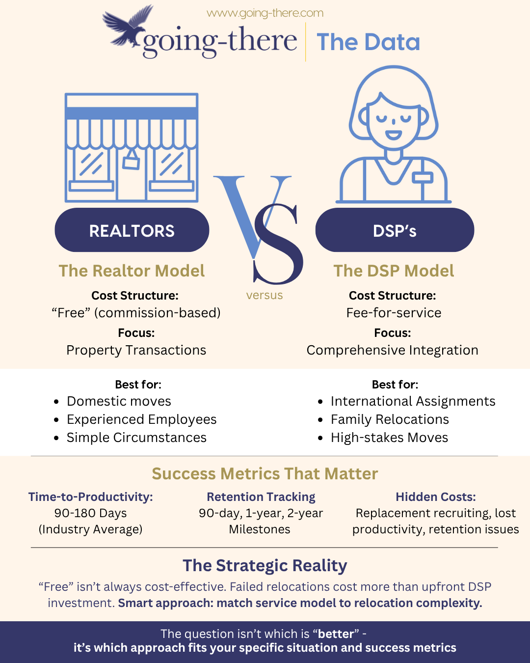 But here's the million-dollar question HR leaders face daily: Should you stick with the tried-and-true realtor model that appears "free" on paper, or invest in comprehensive Destination Services Providers (DSPs) that cost upfront but deliver holistic support?